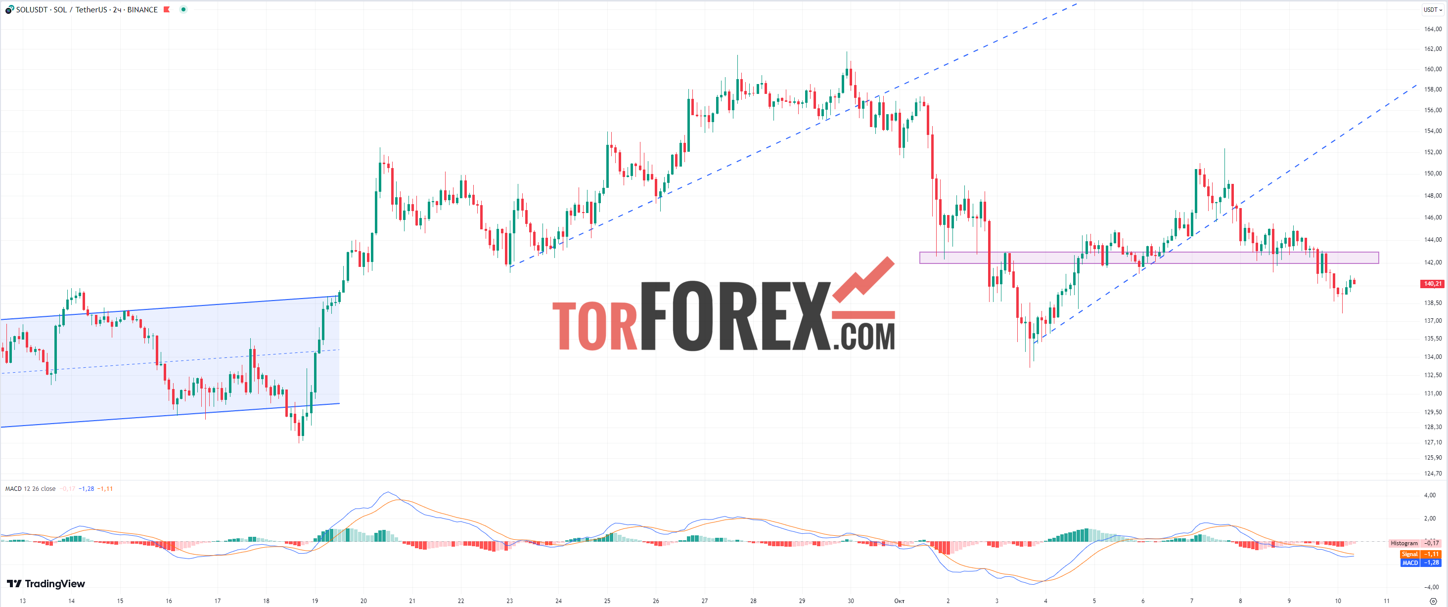 На данный момент Solana находится в среднесрочном нисходящем тренде, что подтверждается техническими индикаторами. Гистограмма MACD расположена ниже средней линии, что указывает на усиление продавцов. Сигнальная линия также подаёт сигнал к продаже, что подтверждает текущий тренд.
