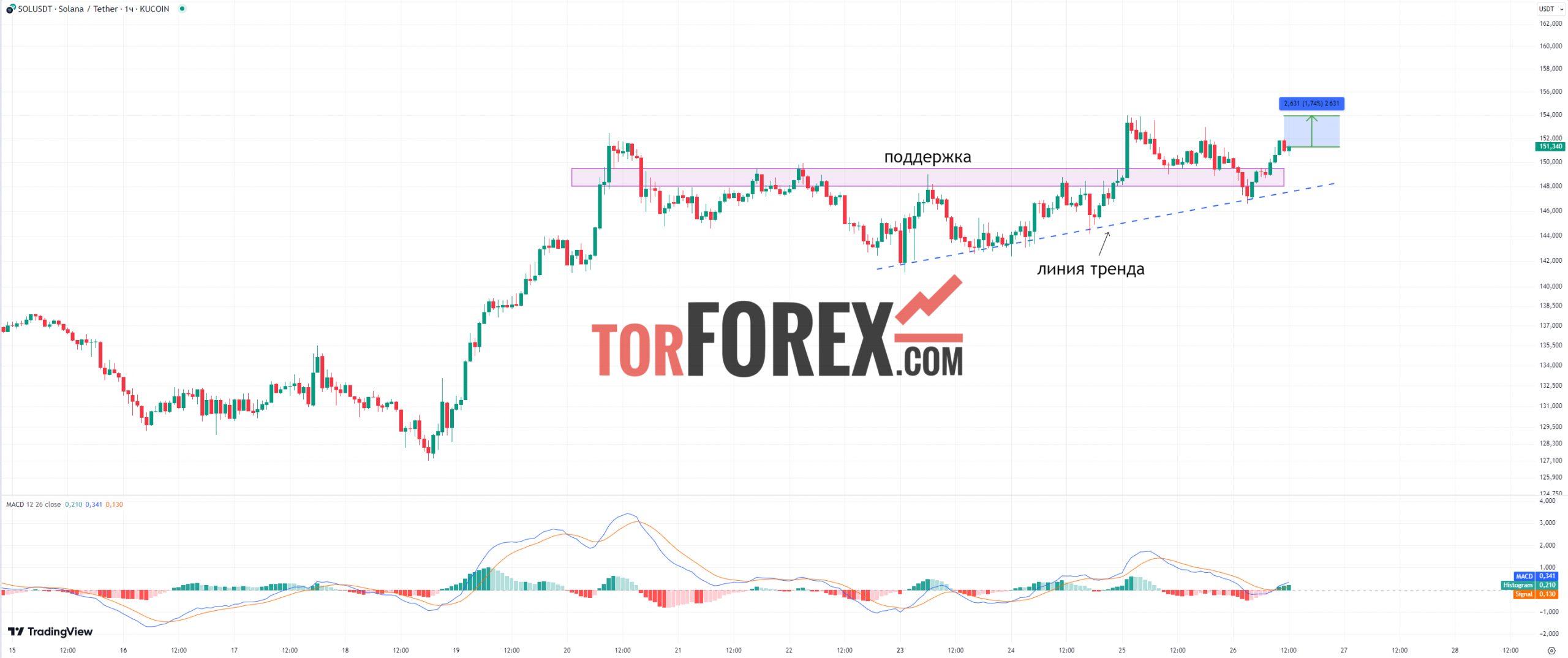 Линия тренда указывает на уверенное движение цены вверх, начиная с уровня поддержки в районе $148. Цена закрепилась выше этой отметки, что говорит о силе покупателей и их намерении удерживать SOL на текущих уровнях.