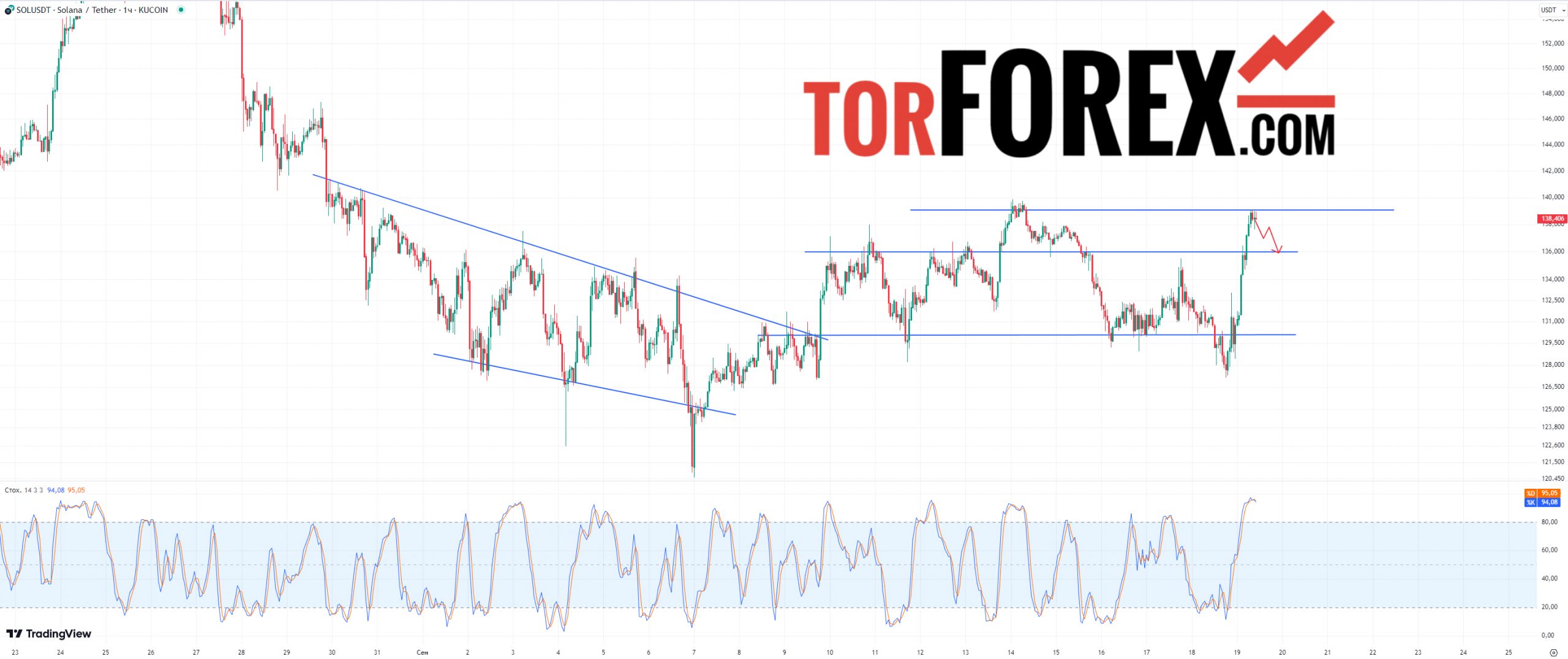 Индикатор Стохастик находится на экстремально высоких уровнях выше 90%, отсюда, SOL/USDT прогноз курса будет снижаться со снятием перепроданности у индикатора хотя бы до уровня 70% — 80%.