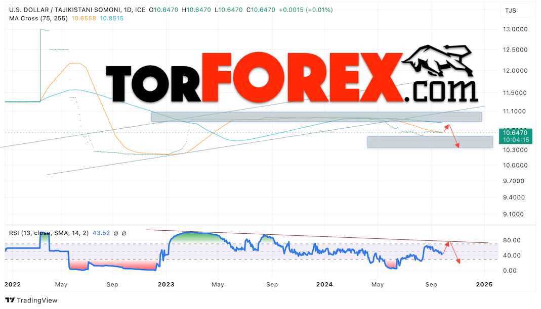 Валютная пара Доллар США Таджикский Сомони USDTJS завершает торговую неделю вблизи отметки 10.64, пара движется без особой активности. Скользящие средние указывают на наличие краткосрочной нисходящей тенденции. Цены тестируют область между сигнальными линиями, что указывает на давление со стороны продавцов американской валюты и потенциальное продолжение падения Доллара США против Таджикского Сомони. В рамках прогноза курса Доллара на 30 сентября — 4 октября 2024 стоит ожидать попытку развития незначительной бычьей коррекции цены и тест уровня сопротивления вблизи области 10.80 Сомони за Доллар США. Затем, отскок вниз и продолжение падения валютной пары в область ниже уровня 10.30.