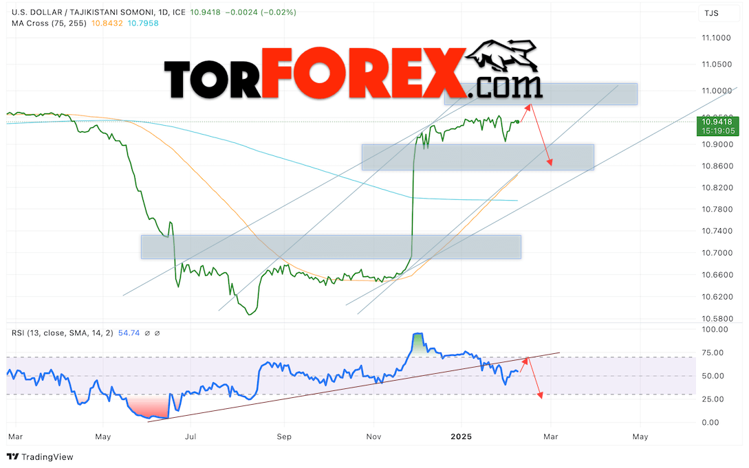 Дополнительным сигналом в пользу снижения валютной пары USD/TJS 10 — 14 февраля 2025 выступит тест пробитой линии тренда на индикаторе относительной силы (RSI). Вторым сигналом станет отбой от области сопротивления на графике цены. Отменой варианта с падением пары USD/TJS станет сильный рост котировок и пробой уровня 10.9905 Сомони за Доллар. Это укажет на пробой области сопротивления и продолжение роста пары Доллар Таджикский Сомони в область выше уровня 11.0375. Подтверждением падению пары выступит пробой области поддержки и закрытие котировок актива под уровнем 10.8905, что укажет на пробой нижней границы бычьего канала.