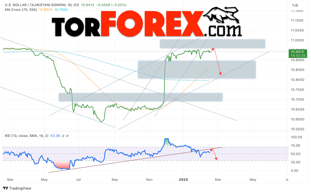 Валютная пара Доллар США Таджикский Сомони USDTJS завершает торговую неделю в рамках роста вблизи отметки 10.9418. Скользящие средние указывают на наличие краткосрочной бычьей тенденции. Цены пробили область между сигнальными линиями вверх, что указывает на давление со стороны покупателей американской валюты и потенциальное продолжение роста Доллара США против Таджикского Сомони. В рамках прогноза курса Доллара на 17 — 21 февраля 2025 стоит ожидать попытку развития подъёма цены и тест уровня сопротивления вблизи области 10.9675 Сомони за Доллар США. Затем, отскок вниз и продолжение падения валютной пары в область ниже уровня 10.8235.