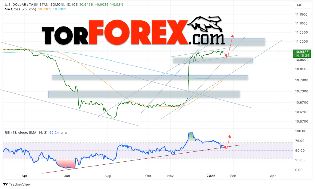 Дополнительным сигналом в пользу подъёма валютной пары USD/TJS 20 — 24 января 2025 выступит тест бычьей линии тренда на индикаторе относительной силы (RSI). Вторым сигналом станет отбой от нижней границы бычьего канала. Отменой варианта роста пары USD/TJS станет падение котировок и пробой уровня 10.8765 Сомони за Доллар. Это укажет на пробой области поддержки и продолжение падения пары Доллар Таджикский Сомони в область ниже уровня 10.7685. Подтверждением росту пары выступит пробой области сопротивления и закрытие котировок актива над уровнем 10.9775, что укажет на пробой верхней границы бычьего канала, а это сигнал к росту на ширину канала.