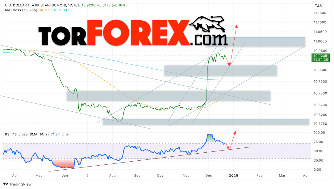 Дополнительным сигналом в пользу подъёма валютной пары USD/TJS 23 — 27 декабря 2024 выступит тест бычьей линии тренда на индикаторе относительной силы (RSI). Вторым сигналом станет отбой от нижней границы бычьего канала. Отменой варианта роста пары USD/TJS станет падение котировок и пробой уровня 10.8205 Сомони за Доллар. Это укажет на пробой области поддержки и продолжение падения пары Доллар Таджикский Сомони в область ниже уровня 10.7505. Подтверждением росту пары выступит пробой области сопротивления и закрытие котировок актива над уровнем 10.9565.