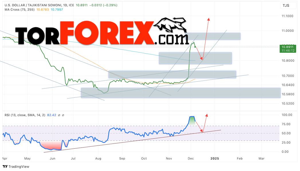 Дополнительным сигналом в пользу подъёма валютной пары USD/TJS 9 — 13 декабря 2024 выступит тест бычьей линии тренда на индикаторе относительной силы (RSI). Вторым сигналом станет отбой от нижней границы бычьего канала. Отменой варианта роста пары USD/TJS станет падение котировок и пробой уровня 10.7685 Сомони за Доллар. Это укажет на пробой области поддержки и продолжение падения пары Доллар Таджикский Сомони в область ниже уровня 10.6505. Подтверждением росту пары выступит пробой области сопротивления и закрытие котировок актива над уровнем 10.9295.