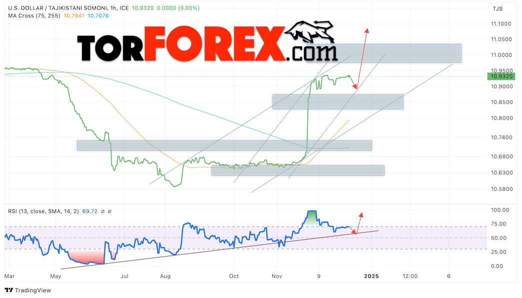 Дополнительным сигналом в пользу роста валютной пары USD/TJS 1 января 2025 выступит отбой от восходящей линии тренда на индикаторе относительной силы (RSI). Вторым сигналом станет отбой от нижней границы бычьего канала. Отменой варианта роста пары USD/TJS станет падение котировок и пробой уровня 10.8545 Сомони за Доллар. Это укажет на пробой области поддержки и продолжение падения пары Доллар Таджикский Сомони в область ниже уровня 10.7885. Подтверждением росту пары выступит пробой области сопротивления и закрытие котировок актива над уровнем 10.9705.