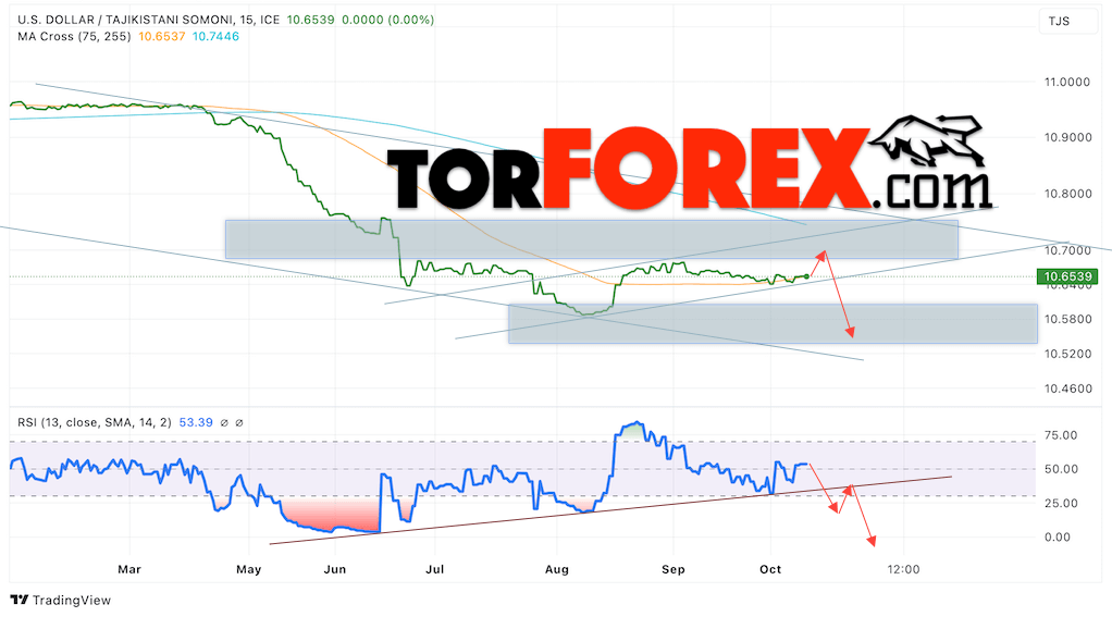 Дополнительным сигналом в пользу снижения валютной пары USD/TJS 10 октября 2024 выступит пробой бычьей линии тренда на индикаторе относительной силы (RSI). Вторым сигналом станет отбой от уровня сопротивления. Отменой варианта снижения пары USD/TJS станет сильный рост котировок и пробой уровня 10.7505 Сомони за Доллар. Это укажет на пробой области сопротивления и продолжение роста пары Доллар Таджикский Сомони в область выше уровня 11.0005. Подтверждением падению пары выступит пробой области поддержки и закрытие котировок актива над уровнем 10.6250, что укажет на пробой нижней границы бычьего канала коррекции.