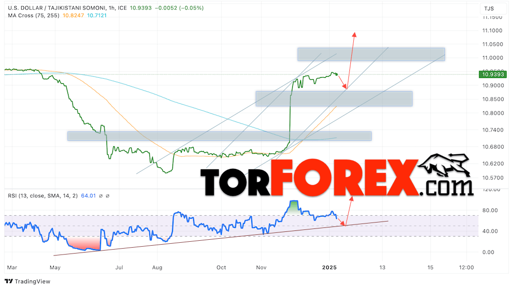 Дополнительным сигналом в пользу роста валютной пары USD/TJS 10 января 2025 выступит отбой от восходящей линии тренда на индикаторе относительной силы (RSI). Вторым сигналом станет отбой от нижней границы бычьего канала. Отменой варианта роста пары USD/TJS станет падение котировок и пробой уровня 10.8575 Сомони за Доллар. Это укажет на пробой области поддержки и продолжение падения пары Доллар Таджикский Сомони в область ниже уровня 10.7765. Подтверждением росту пары выступит пробой области сопротивления и закрытие котировок актива над уровнем 10.9705.