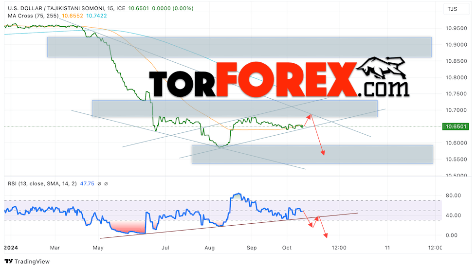 Дополнительным сигналом в пользу снижения валютной пары USD/TJS 11 октября 2024 выступит пробой бычьей линии тренда на индикаторе относительной силы (RSI). Вторым сигналом станет отбой от уровня сопротивления. Отменой варианта снижения пары USD/TJS станет сильный рост котировок и пробой уровня 10.7205 Сомони за Доллар. Это укажет на пробой области сопротивления и продолжение роста пары Доллар Таджикский Сомони в область выше уровня 11.0005. Подтверждением падению пары выступит пробой области поддержки и закрытие котировок актива над уровнем 10.6250, что укажет на пробой нижней границы бычьего канала коррекции.