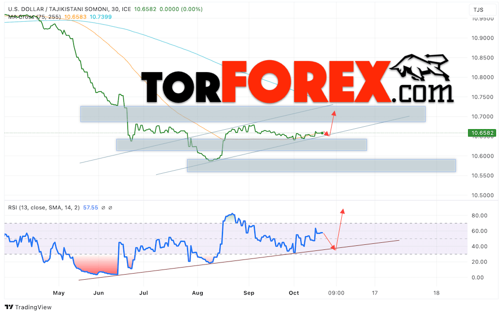 Дополнительным сигналом в пользу роста валютной пары USD/TJS 17 октября 2024 выступит пробой бычьей линии тренда на индикаторе относительной силы (RSI). Вторым сигналом станет отбой от нижней границы бычьего канала. Отменой варианта роста пары USD/TJS станет падение котировок и пробой уровня 10.6355 Сомони за Доллар. Это укажет на пробой области поддержки и продолжение падения пары Доллар Таджикский Сомони в область ниже уровня 10.6165. Подтверждением росту пары выступит пробой области сопротивления и закрытие котировок актива над уровнем 10.6665.