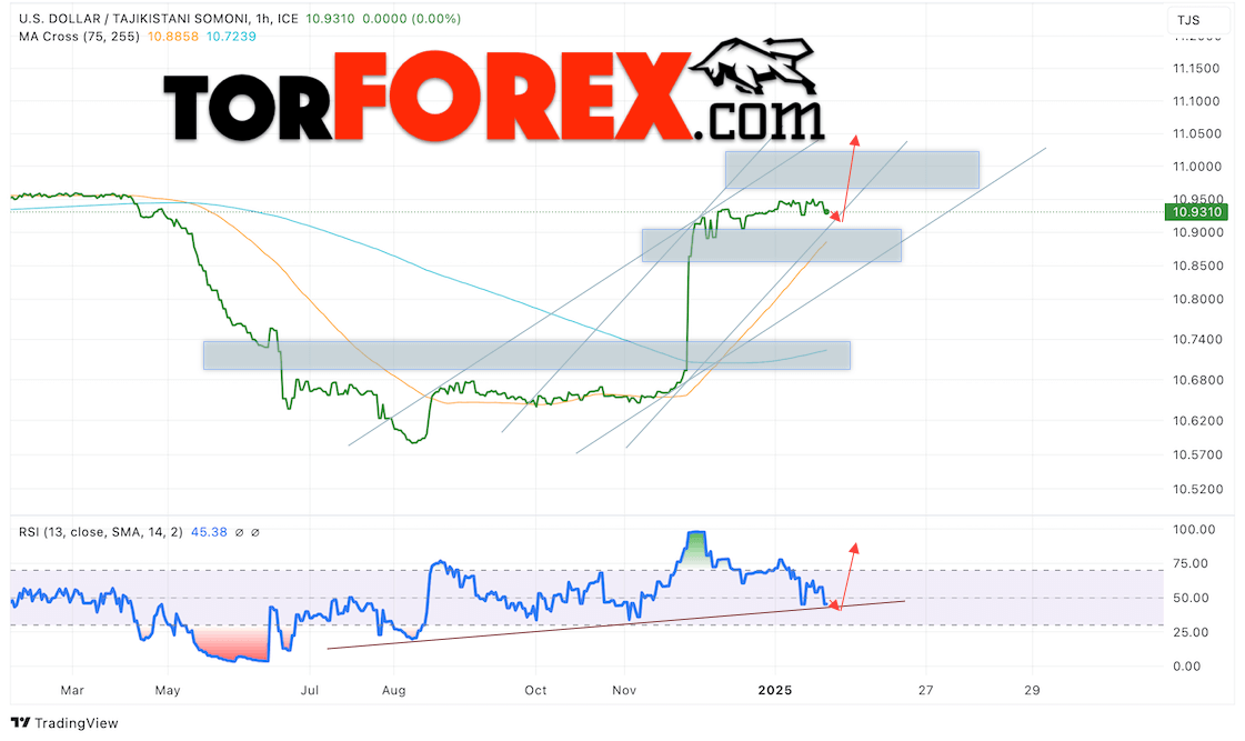 Дополнительным сигналом в пользу роста валютной пары USD/TJS 24 января 2025 выступит отбой от бычьей линии тренда на индикаторе относительной силы (RSI). Вторым сигналом станет отбой от нижней границы бычьего канала. Отменой варианта роста пары USD/TJS станет падение котировок и пробой уровня 10.8745 Сомони за Доллар. Это укажет на пробой области поддержки и продолжение падения пары Доллар Таджикский Сомони в область ниже уровня 10.8405. Подтверждением росту пары выступит пробой области сопротивления и закрытие котировок актива над уровнем 10.9645.