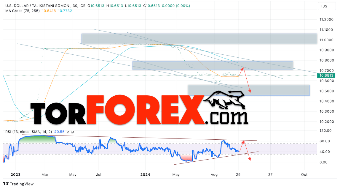 Дополнительным сигналом в пользу снижения валютной пары USD/TJS 26 сентября 2024 выступит тест медвежьей линии тренда на индикаторе относительной силы (RSI). Вторым сигналом станет пробой от нижней границы бычьего канала. Отменой варианта снижения пары USD/TJS станет сильный рост котировок и пробой уровня 10.90 Сомони за Доллар. Это укажет на пробой области сопротивления и продолжение роста пары Доллар Таджикский Сомони в область выше уровня 12.25. Подтверждением падению пары выступит пробой области поддержки и закрытие котировок актива над уровнем 10.55.