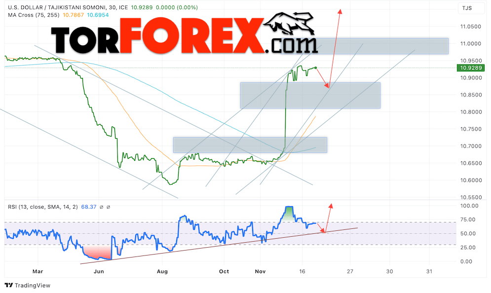Дополнительным сигналом в пользу роста валютной пары USD/TJS 27 декабря 2024 выступит отбой от восходящей линии тренда на индикаторе относительной силы (RSI). Вторым сигналом станет отбой от нижней границы бычьего канала. Отменой варианта роста пары USD/TJS станет падение котировок и пробой уровня 10.8335 Сомони за Доллар. Это укажет на пробой области поддержки и продолжение падения пары Доллар Таджикский Сомони в область ниже уровня 10.7765. Подтверждением росту пары выступит пробой области сопротивления и закрытие котировок актива над уровнем 10.9705.