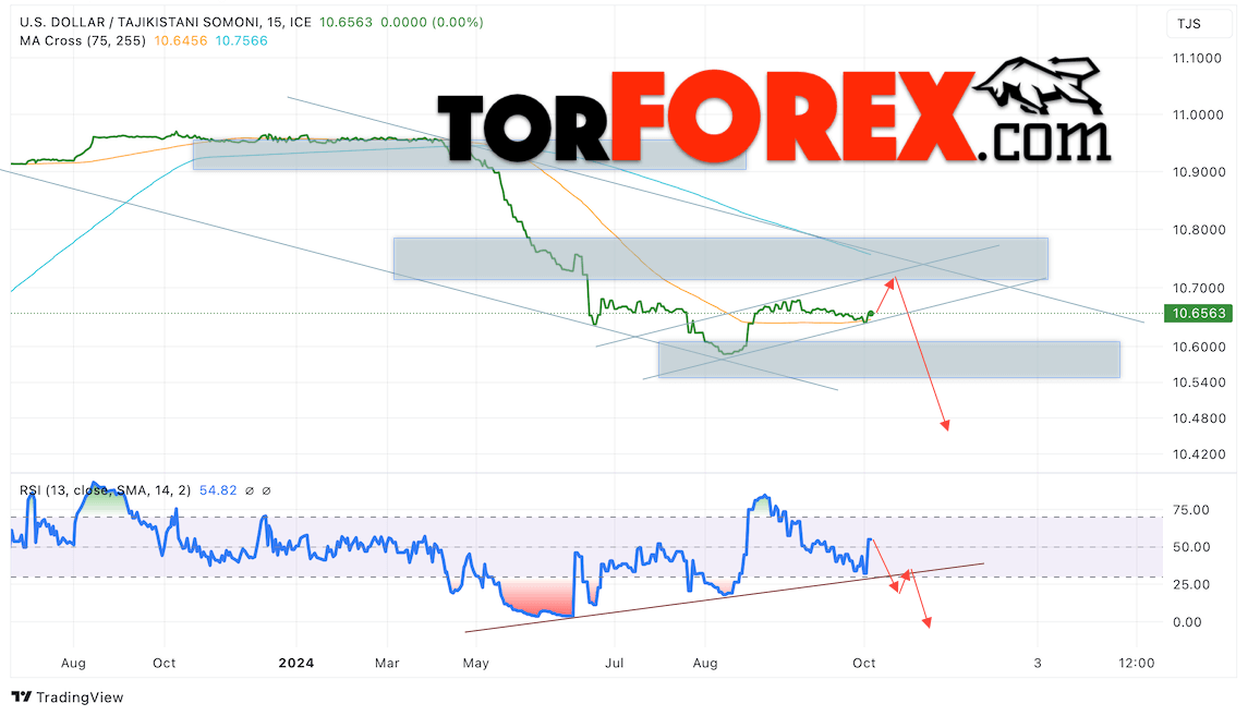 Валютная пара Доллар США Таджикский Сомони USDTJS продолжает движение в рамках коррекции и медвежьего канала. В момент публикации прогноза курс Доллара США к Таджикскому Сомони составляет 10.6563. Скользящие средние указывают на наличие краткосрочной нисходящей тенденции. Цены тестируют область между сигнальными линиями, что указывает на давление со стороны продавцов американской валюты и потенциальное продолжение падения Доллара США против Таджикского Сомони. В рамках прогноза курса Доллара на 3 октября 2024 стоит ожидать попытку развития незначительной бычьей коррекции цены и тест уровня сопротивления вблизи области 10.7000 Сомони за Доллар США. Затем, отскок вниз и продолжение падения валютной пары в область ниже уровня 10.5000.