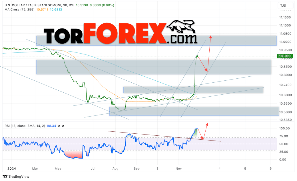 Дополнительным сигналом в пользу роста валютной пары USD/TJS 4 декабря 2024 выступит отбой от линии поддержки на индикаторе относительной силы (RSI). Вторым сигналом станет отбой от нижней границы бычьего канала. Отменой варианта роста пары USD/TJS станет падение котировок и пробой уровня 10.7805 Сомони за Доллар. Это укажет на пробой области поддержки и продолжение падения пары Доллар Таджикский Сомони в область ниже уровня 10.6865. Подтверждением росту пары выступит пробой области сопротивления и закрытие котировок актива над уровнем 10.9505.