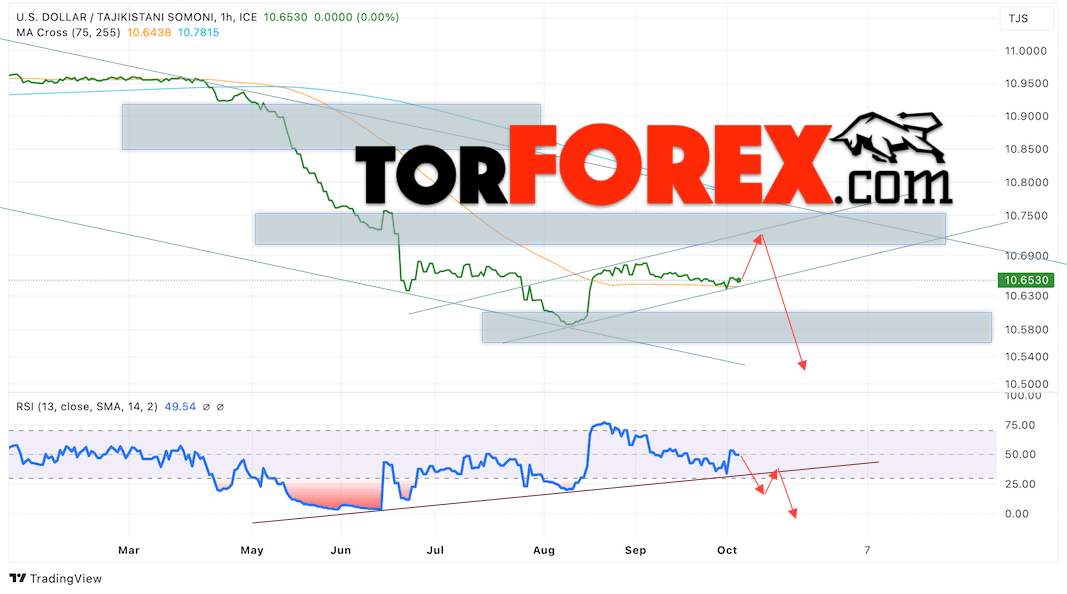 Дополнительным сигналом в пользу снижения валютной пары USD/TJS 4 октября 2024 выступит пробой бычьей линии тренда на индикаторе относительной силы (RSI). Вторым сигналом станет отбой от уровня сопротивления. Отменой варианта снижения пары USD/TJS станет сильный рост котировок и пробой уровня 10.8000 Сомони за Доллар. Это укажет на пробой области сопротивления и продолжение роста пары Доллар Таджикский Сомони в область выше уровня 11.0500. Подтверждением падению пары выступит пробой области поддержки и закрытие котировок актива над уровнем 10.6000.