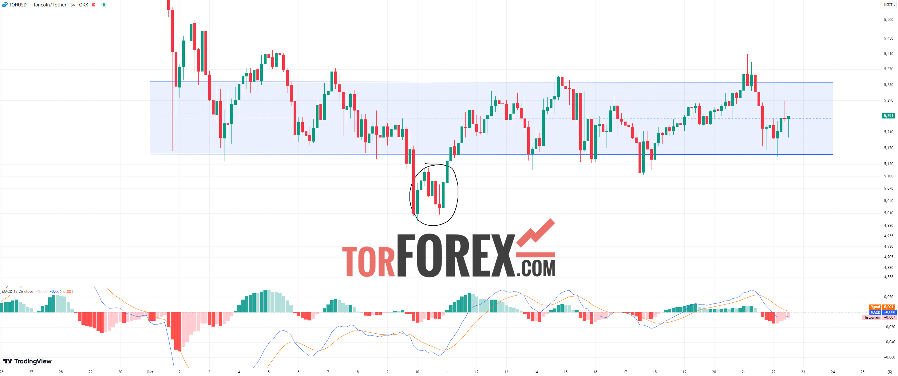 На данный момент цена TON остается в боковом тренде, торгуясь в пределах параллельного канала с границами 5,15$ и 5,34$. Цена находится в середине диапазона, поэтому делать четких выводов о направлении тренда пока нельзя. Индикатор MACD демонстрирует силу медведей: его гистограмма располагается ниже средней линии, что указывает на возможное продолжение снижение цены.