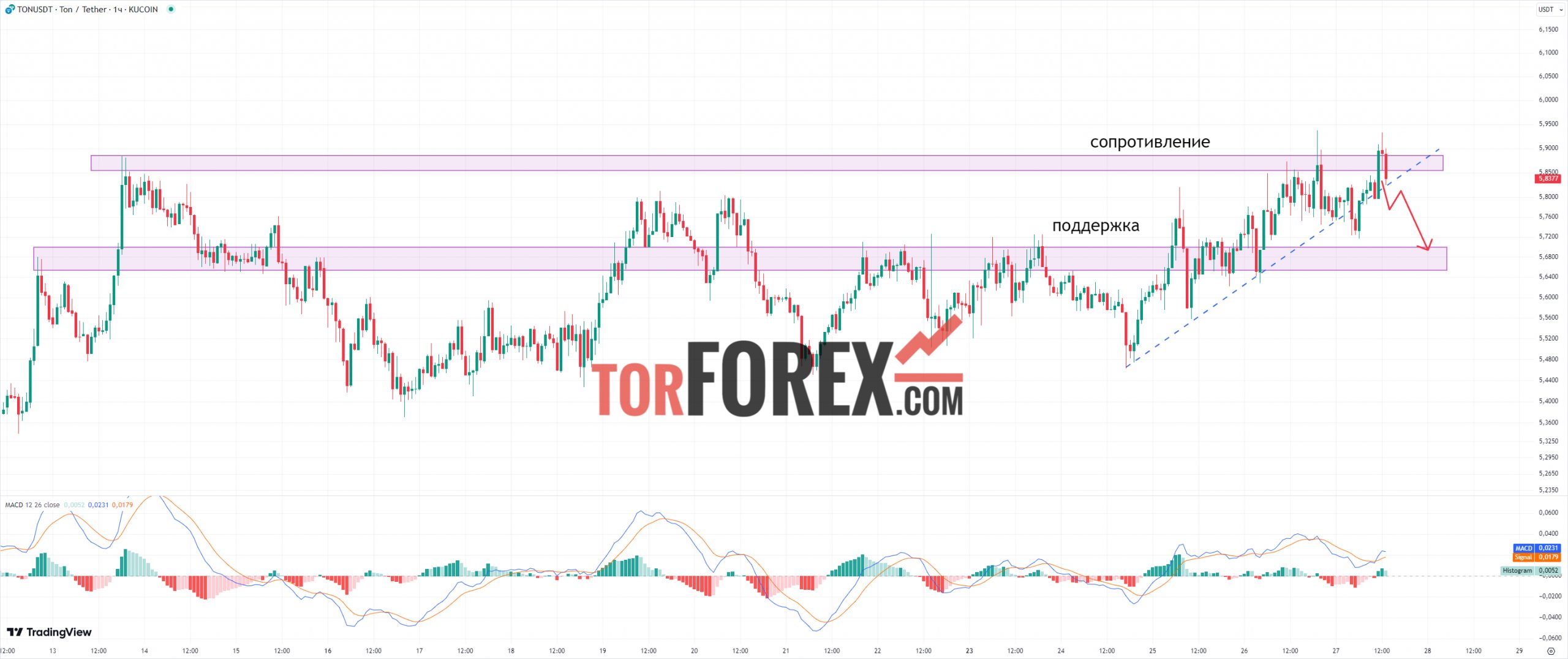 На момент написания тонкоин прогноз на сегодня, цена TON остановила рост вблизи сильного уровня сопротивления. Рассмотрим подробнее графические паттерны и сигналы индикатора MACD.