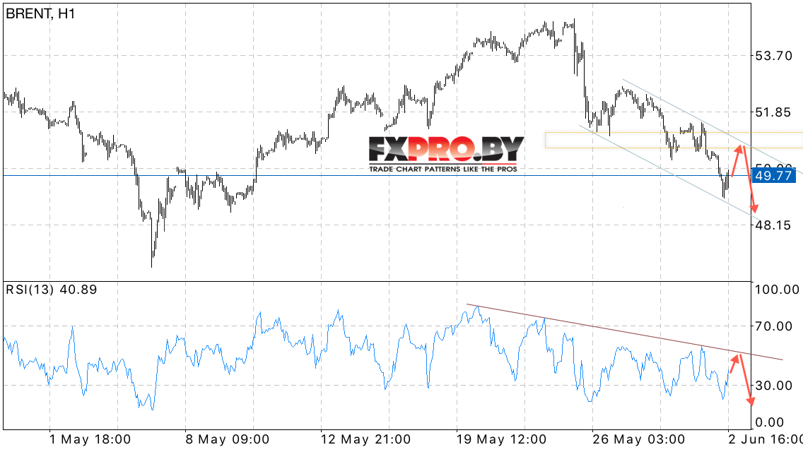 Котировки нефти марки BRENT продолжают движение в рамках падения. На данный момент стоит ожидать попытку коррекции в область верхней границы нисходящего канала и продолжения падения цен на нефть в область ниже уровня 48 долларов за баррель.