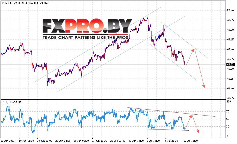 Таким образом, Аналитика и прогноз цен на нефть на 11 июля 2017 предполагает попытку теста верхней границы нисходящего канала и продолжения снижения в область ниже уровня 44.50, дополнительным сигналом в пользу снижения выступит тест линии сопротивления на индикаторе относительной силы.
