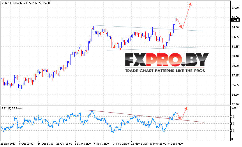 Таким образом, Аналитика и прогноз цен на нефть на 13 декабря 2017 предполагает попытку теста верхней границы модели «Треугольник» вблизи уровня 64.10, откуда стоит ожидать отскок и рост цены нефти с целью выше уровня 67.00, отменой варианта роста цены нефти BRENT станет пробой уровня 64.00, что укажет на продолжение падения.