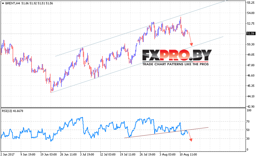 Таким образом, Аналитика и прогноз цен на нефть на 15 августа 2017 предполагает попытку падения в область нижней границы канала на уровне 50 долларов за баррель, дополнительным сигналом в пользу снижения выступает пробой линии поддержки на индикаторе относительной силы.
