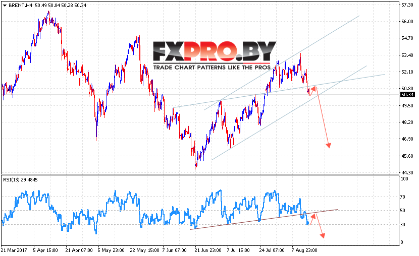 Таким образом, Аналитика и прогноз цен на нефть на 16 августа 2017 предполагает попытку пробоя нижней границы канала и продолжения снижения в область ниже уровня 46, дополнительным сигналом в пользу снижения выступает пробой линии поддержки на индикаторе относительной силы.