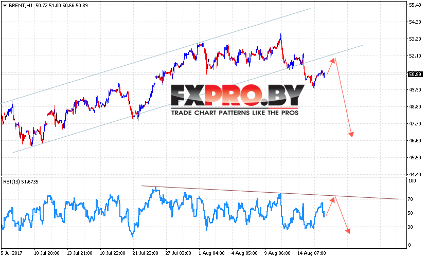 Таким образом, Аналитика и прогноз цен на нефть на 17 августа 2017 предполагает попытку теста области 52 и продолжения снижения в область ниже уровня 47, дополнительным сигналом в пользу снижения выступит тест линии сопротивления на индикаторе относительной силы.
