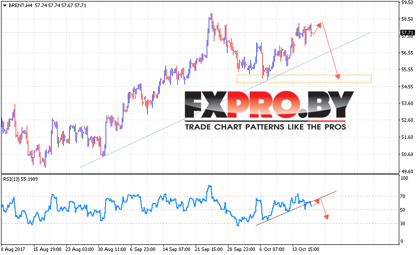 Таким образом, Аналитика и прогноз цен на нефть на 19 октября 2017 предполагает попытку падения котировок и цен на нефть с первой целью вблизи уровня 55 долларов за баррель, в пользу снижения выступает пробой линии тренда на индикаторе относительной силы, отменой варианта падения станет пробой уровня 59.50, что укажет на продолжение роста котировок BRENT выше уровня 62.