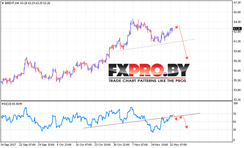 Таким образом, Аналитика и прогноз цен на нефть на 24 ноября 2017 предполагает попытку снижения цен на нефть с целью ниже уровня 58, в пользу падения цен на нефть выступает тест линии тренда на индикаторе относительной силы, отменой варианта падения цены нефти BRENT станет пробой уровня 65, что укажет на продолжение роста.