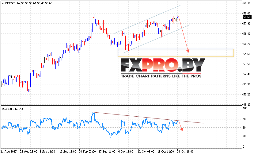Котировки нефти марки BRENT продолжают торговаться в рамках роста. На данный момент стоит ожидать начала падения нефти в область ниже уровня 55 долларов. В пользу падения котировок и цен на нефть BRENT выступает тест линии сопротивления на индикаторе относительной силы.