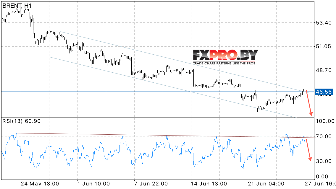 Таким образом, Аналитика и прогноз цен на нефть на 28 июня 2017 предполагает попытку отскока от верхней границы нисходящего канала с потенциальной целью снижения вблизи уровня 44 долларов за баррель, отменой стане пробой уровня 47 долларов за баррель.