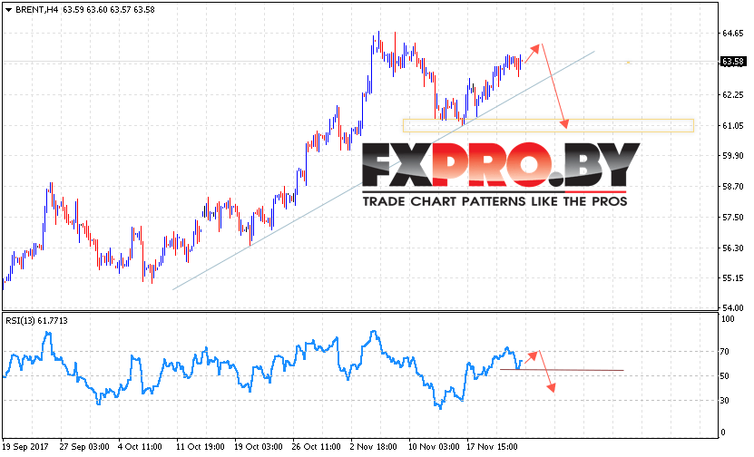 Таким образом, Аналитика и прогноз цен на нефть на 28 ноября 2017 предполагает попытку снижения цен на нефть с целью ниже уровня 61, в пользу падения цен на нефть выступает формирование разворотной модели на индикаторе относительной силы, отменой варианта падения цены нефти BRENT станет пробой уровня 65, что укажет на продолжение роста.
