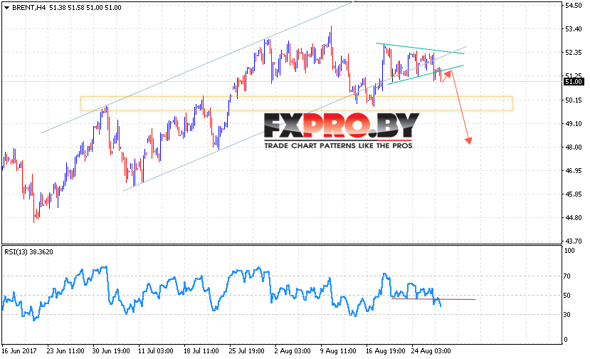 Таким образом, Аналитика и прогноз цен на нефть на 30 августа 2017 предполагает попытку продолжения падения цен на нефть в область ниже уровня 48 долларов за баррель,  в рамках отработки модели Треугольник, дополнительным сигналом выступает пробой линии поддержки на индикаторе относительной силы, отменой станет рост выше уровня 53 доллара за баррель.