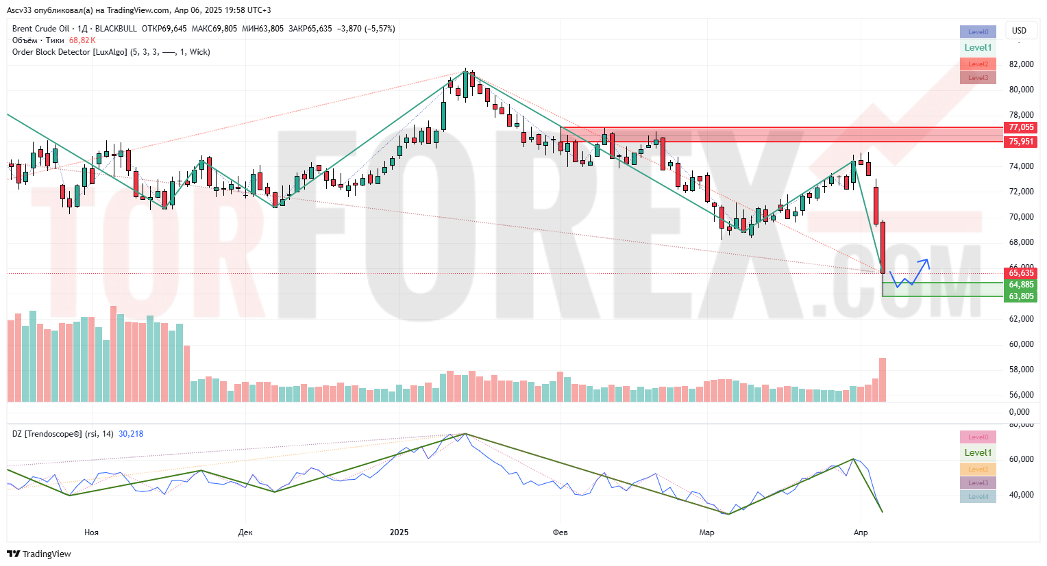 На фоне рыночного давления и негативных факторов нефть марки Brent обвалилась более чем на 5.5% за день, закрывшись на уровне 65.63 USD. Это самое низкое значение с начала 2025 года. Снижение сопровождалось всплеском объёма и уходом RSI в зону перепроданности. Цена достигла области Bullish Order Block, откуда возможно краткосрочное восстановление — либо продолжение нисходящего тренда при пробое поддержки.