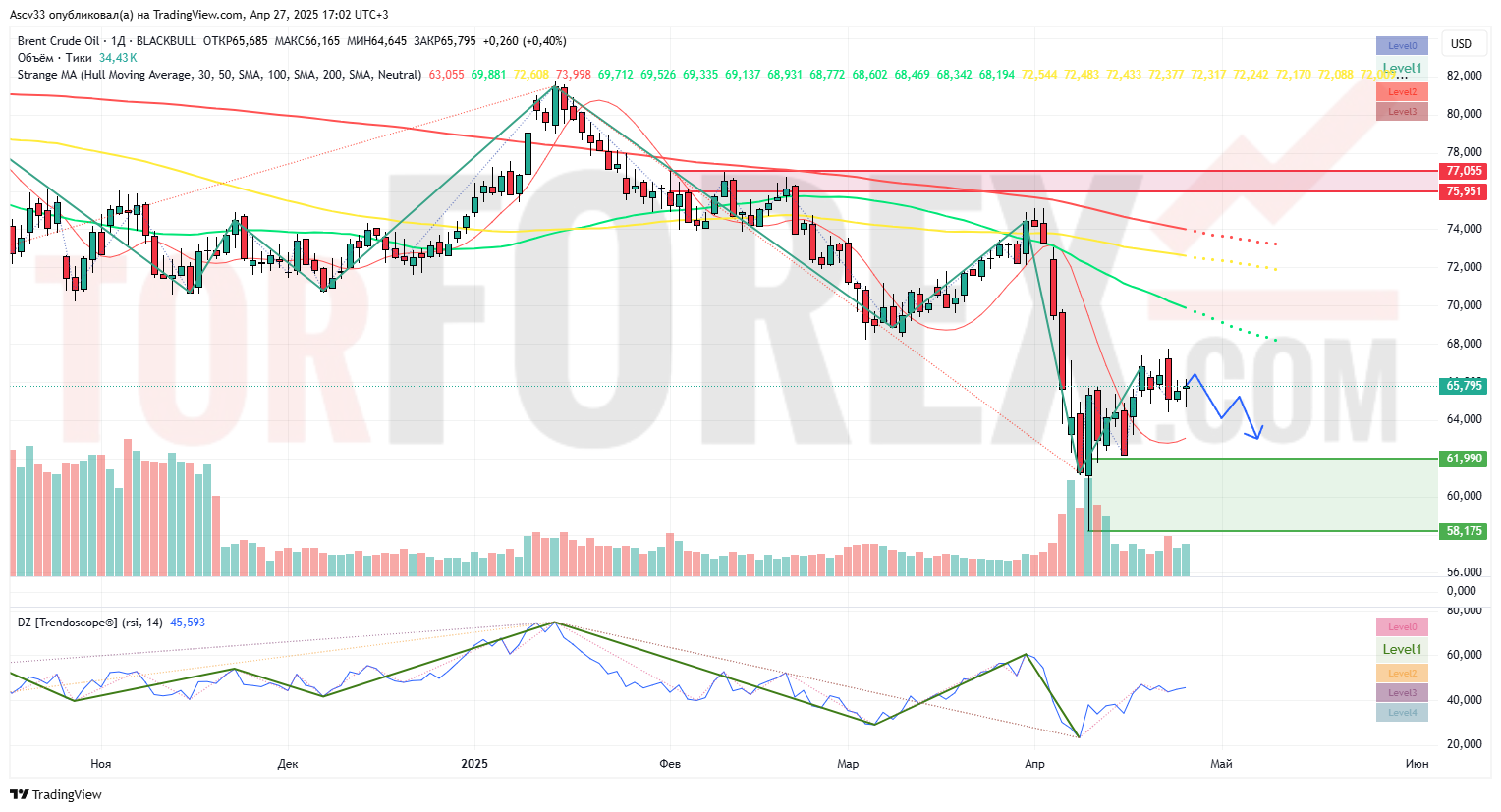 На дневном графике Brent торгуется в районе 65,79 долларов за баррель. Цена остаётся ниже всех основных скользящих средних EMA 50, EMA 100 и EMA 200, что подтверждает наличие среднесрочного нисходящего тренда.