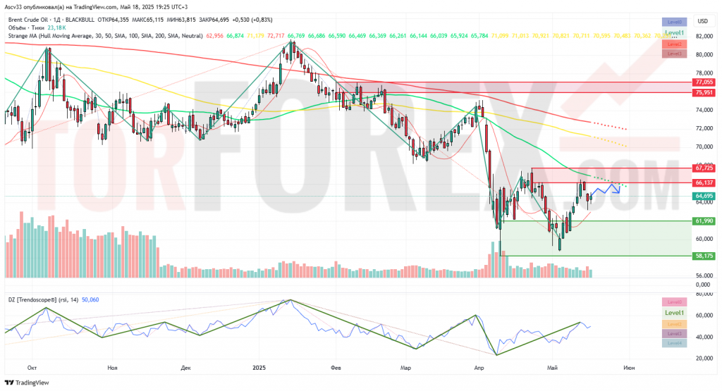 Нефть марки Brent демонстрирует восстановление после резкого падения в апреле. На фоне стабилизации мировых настроений и ослабления доллара котировки поднялись к уровню $64.70. Однако движение замедляется вблизи важной области сопротивления, и предстоящая неделя может стать решающей для определения дальнейшего тренда.