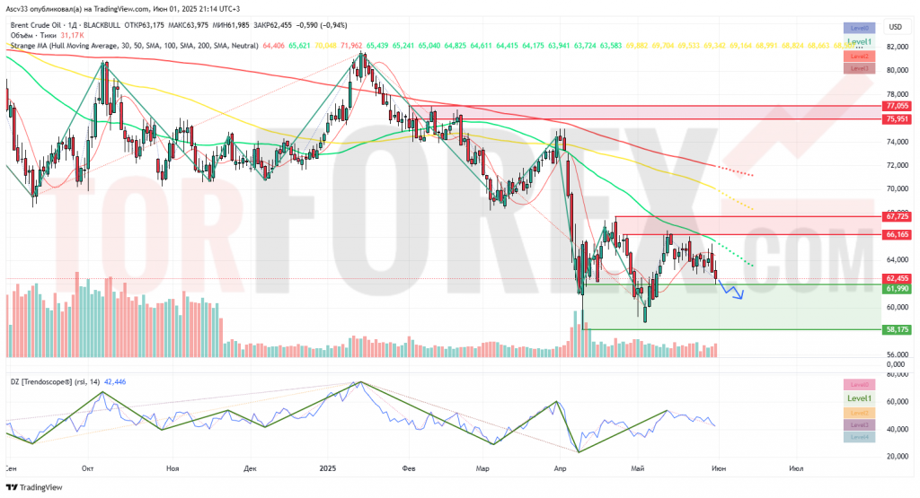 Цена Brent торгуется ниже всех ключевых скользящих средних (EMA 50, 100 и 200), что указывает на доминирование медведей. После отката от апрельских минимумов в районе $58, котировки сформировали максимум у $67,725 и вновь опустились в зону консолидации.