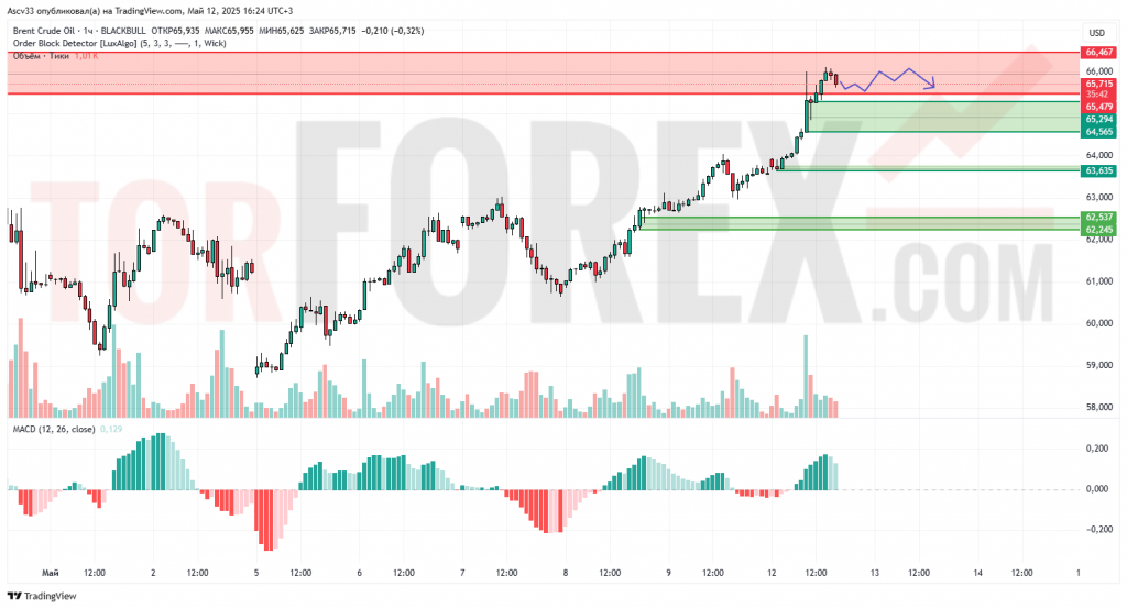 Нефть Brent продолжает уверенное восходящее движение, однако достигла сильной зоны сопротивления 65,71–66,46, где ранее наблюдалось давление со стороны продавцов. Цена замедлилась вблизи локального максимума, а объёмы начали снижаться. Индикатор MACD остаётся в положительной зоне, но его гистограмма указывает на возможное замедление импульса.