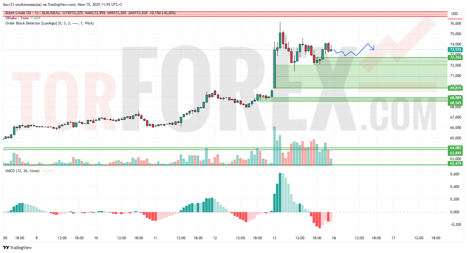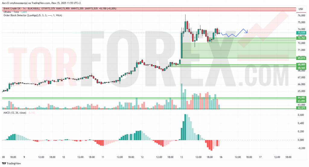Цена на нефть Brent консолидируется после стремительного роста, достигнув зоны сопротивления у отметки 74,00. Повышенные объёмы на выходе из диапазона указывают на активность покупателей, но текущая свечная структура свидетельствует о неуверенности в продолжении роста без отката. Вероятен период боковой динамики с возможной локальной коррекцией.
