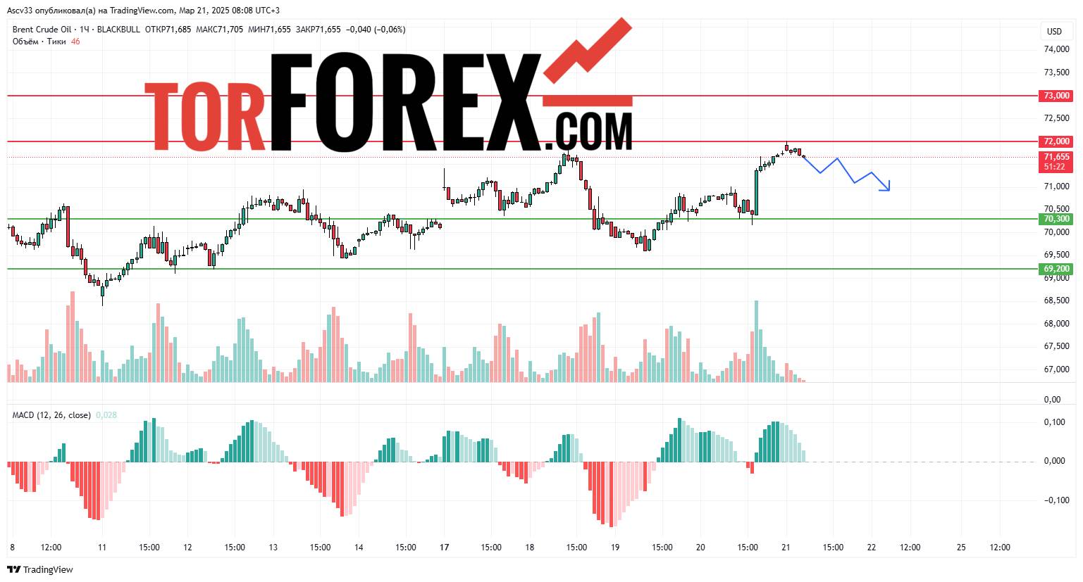 Технические индикаторы указывают на вероятность консолидации в текущем диапазоне. Если цена поднимется выше 72,00 USD, это может служить сигналом о продолжении роста, в то время как падение ниже 70,30 USD подтвердит возможный разворот.