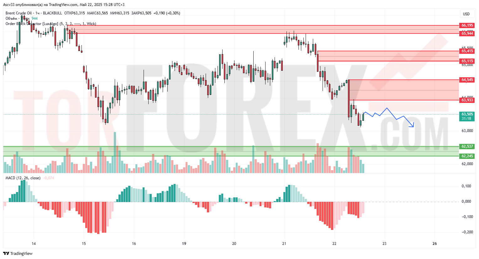 С высокой вероятностью цена продолжит снижение в зону 62,50–62,20 после периода краткосрочной консолидации в диапазоне 63,00–63,90. Для смены направления необходим пробой выше 64,55 с ростом объёмов, что на текущий момент маловероятно. Приоритет сохраняется за продажами и снижением.