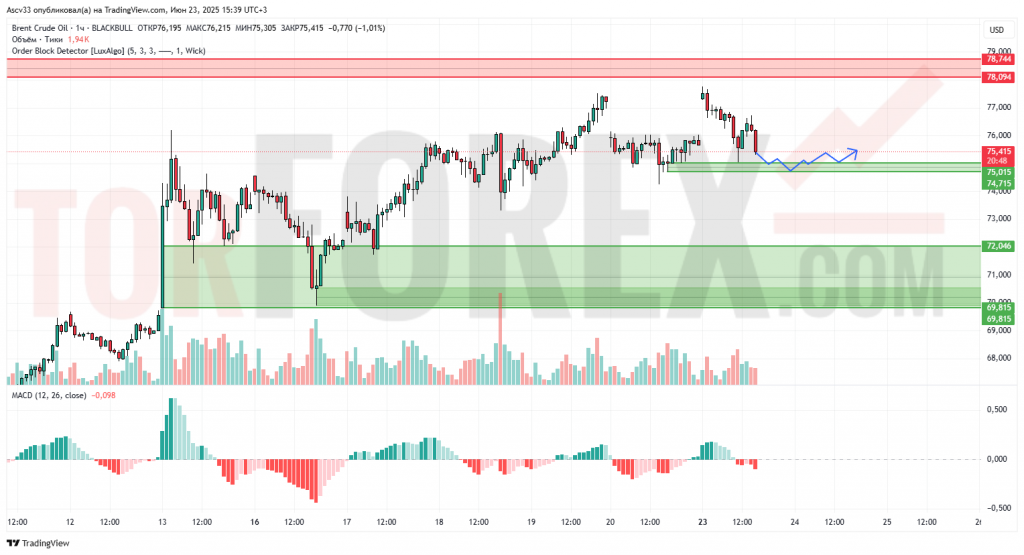 Brent корректируется вниз после теста сопротивления в районе 76,9–78,1, не сумев закрепиться выше. В последние часы наблюдается снижение на повышенном объеме, что говорит об усилении активности продавцов. Цена опустилась к первой зоне поддержки 75,0–74,7, где возможно формирование краткосрочного бокового движения или попытка отскока. Индикатор MACD перешел в отрицательную зону, сигнализируя об ослаблении восходящего импульса.