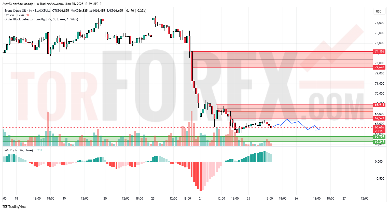 После резкого обвала с уровней выше 74, нефть Brent стабилизировалась у зоны поддержки 65,75–65,25 и начала формировать слабое восстановление. Тем не менее, движение остаётся под давлением, и попытки роста ограничиваются уровнем 67,00, что указывает на сильное сопротивление со стороны продавцов.
