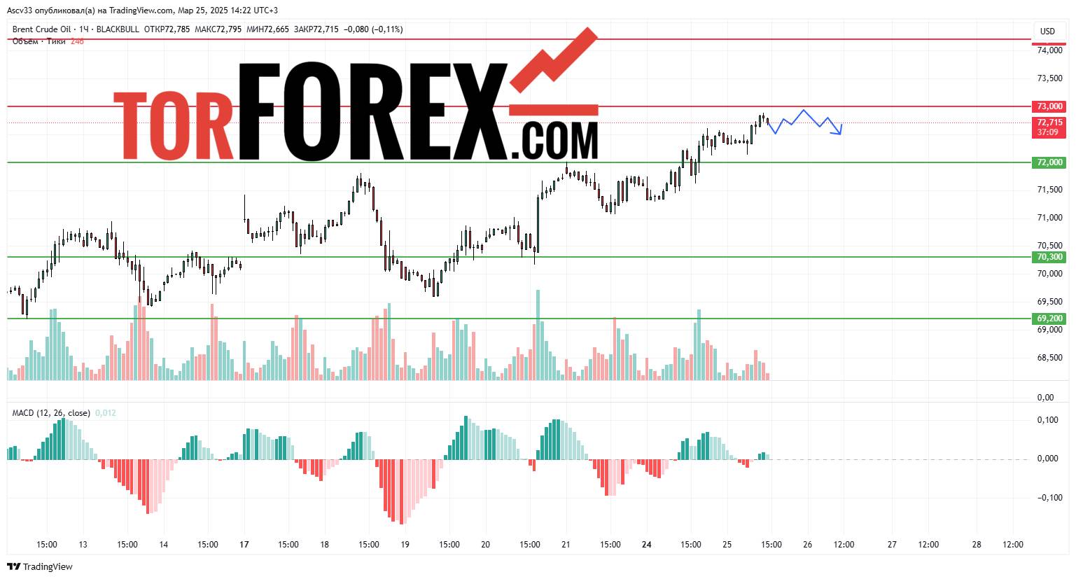 Скорее всего, цена Brent останется в пределах $72,00–$73,00 в течение ближайших 24 часов. Прорыв выше $73,00 может подтолкнуть котировки к отметке $74,20 и выше. Напротив, снижение ниже $72,00 откроет дорогу к повторному тесту уровня $70,30. Участникам рынка стоит внимательно отслеживать реакцию на ключевые уровни — именно они могут указать на ближайшее направление ценовой динамики.