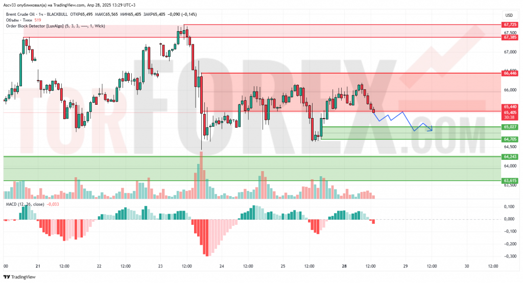 Ожидается продолжение давления с пробоем 65,000 вниз. Следующая цель снижения — зона 64,700–64,200. При возврате выше 65,440 откроется путь к локальной консолидации в диапазоне 65,400–66,400.