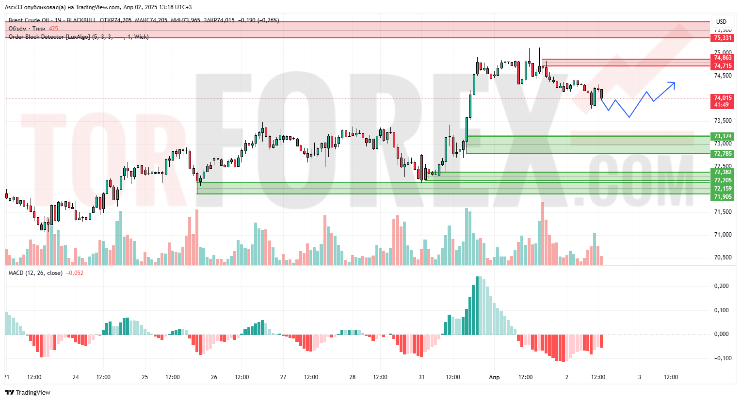 Ожидается попытка восстановления к зоне сопротивления $74,70–74,85. В случае пробоя — возможен импульс к $75,30. Однако если цена не преодолеет сопротивление, вероятна консолидация в диапазоне $73,20–$74,70 с повышенной волатильностью.