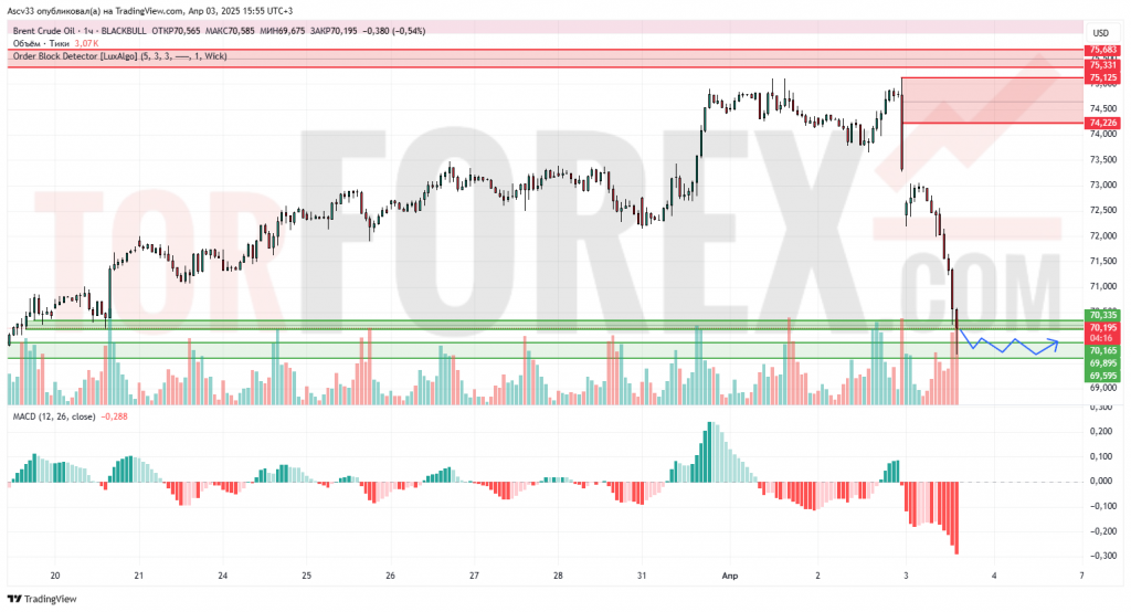 На часовом графике нефти марки Brent наблюдается стремительное снижение после неудачного теста зоны сопротивления в районе $74,20–75,10. Цена пробила ключевые уровни и тестирует плотную зону спроса в районе $70,00.