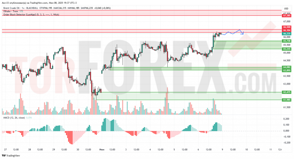 Нефть марки Brent продолжает движение в устойчивом восходящем канале и в данный момент тестирует область сопротивления в районе 66,30–66,50. Быки уверенно продвинулись вверх, однако цена входит в зону предложения, где в прошлом происходили развороты. Индикатор MACD показывает положительное значение, но сигнализирует о возможном замедлении импульса.