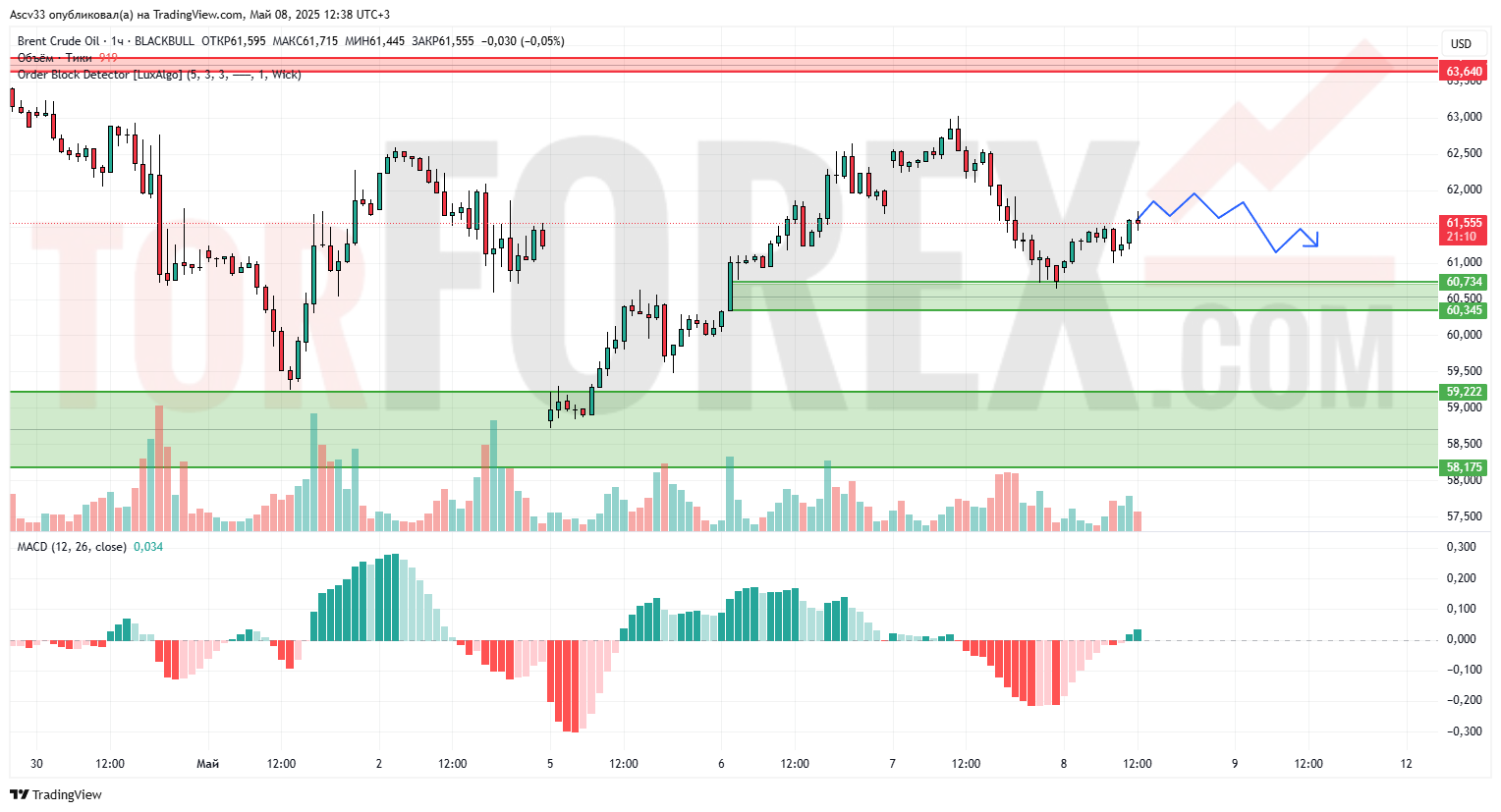 После локального отскока от зоны спроса 60,3–60,7 нефть Brent снова тестирует верхние уровни, но импульс выглядит сдержанным. Цена остаётся под давлением ниже зоны сопротивления 63,6, где ранее наблюдалось активное предложение. Индикатор MACD демонстрирует попытку восстановления, но общий тон остаётся умеренно нейтральным.